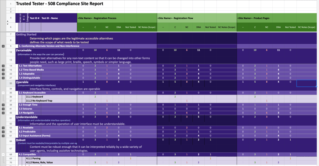 The screenshots here show the the criteria and results for each 508 compliance standard, as well as a roll-up report. These are my own templates customized to enable report data export.